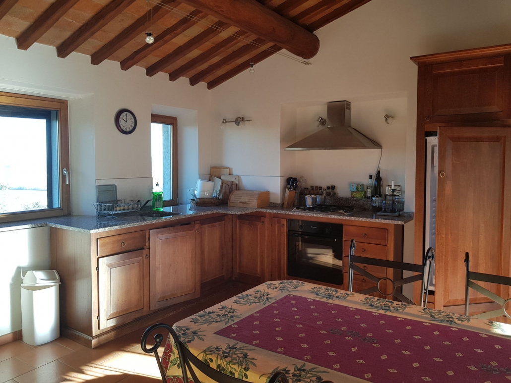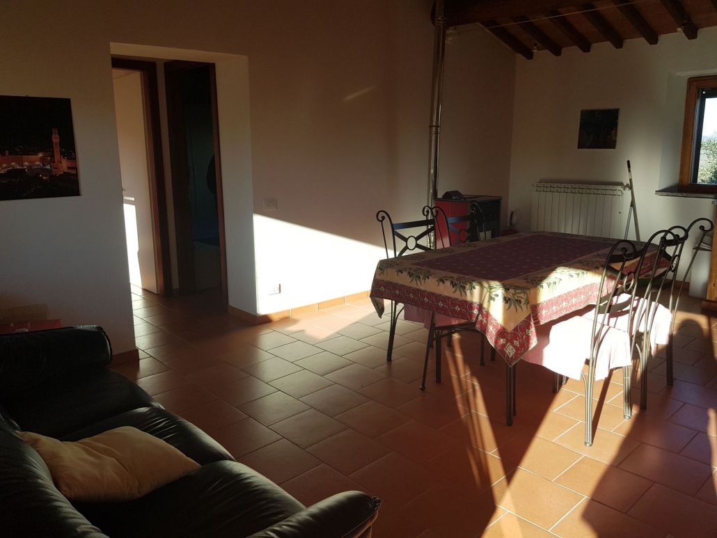 Girasole è al primo piano , con 3 camere da letto ( 1 camera matrimoniale, una camera con 2 letti singoli e una camera singola), soggiorno con cucina e bagno con doccia, vista su San Giminiano e gli uliveti.