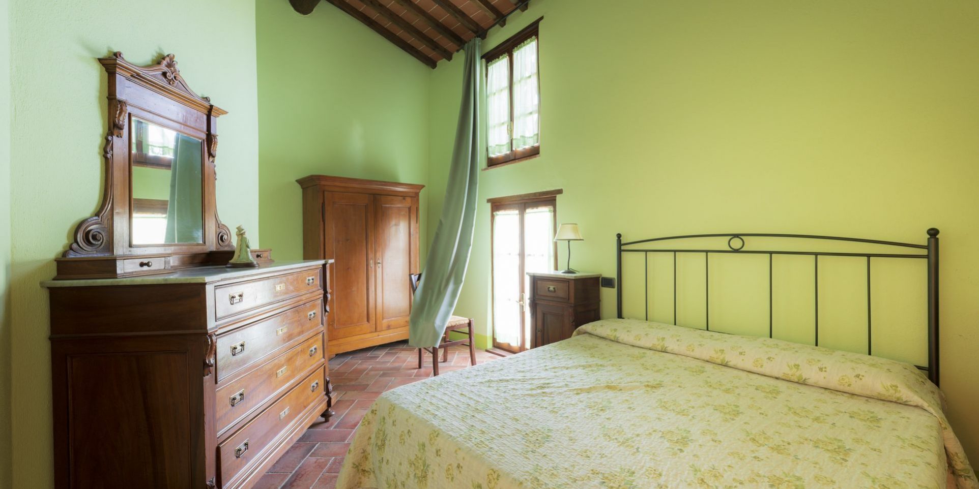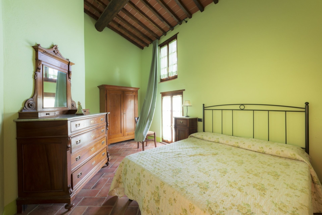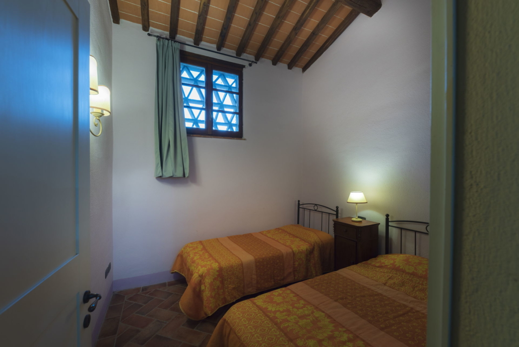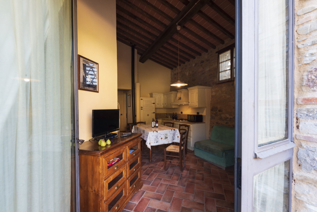 È composto da soggiorno-cucina con poltrona letto, tavolo da pranzo e camino, un bagno con doccia, una camera matrimoniale, una camera per bambini. All’esterno, un ampio giardino privato con solarium, tavolo con sedie, con una tettoia e una bellissima vista panoramica di Casole d’Elsa e vigneti.